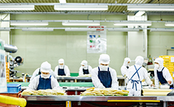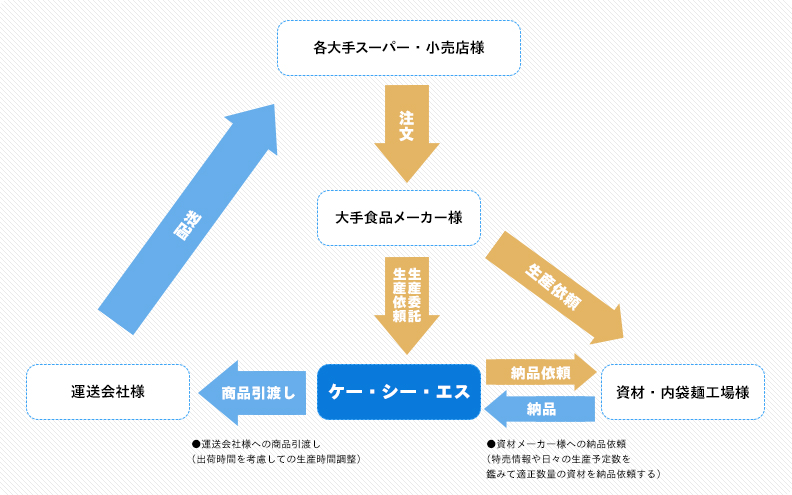 当社は、大手食品会社から生産委託されたチルド麺の包装加工を行っており、資材入荷から出荷までの各プロセスにおいて、資材の仕様情報から、商品情報に至るまでデータ化・画像化して「見える化」を実践しております。情報の「見える化」を徹底することにより『安心・安全な商品』をお客様にお届けしております。また、全作業プロセスの標準化を推進し、従業員教育の徹底と定期的な見直し・改善により、作業品質の向上と安定化を図っております。